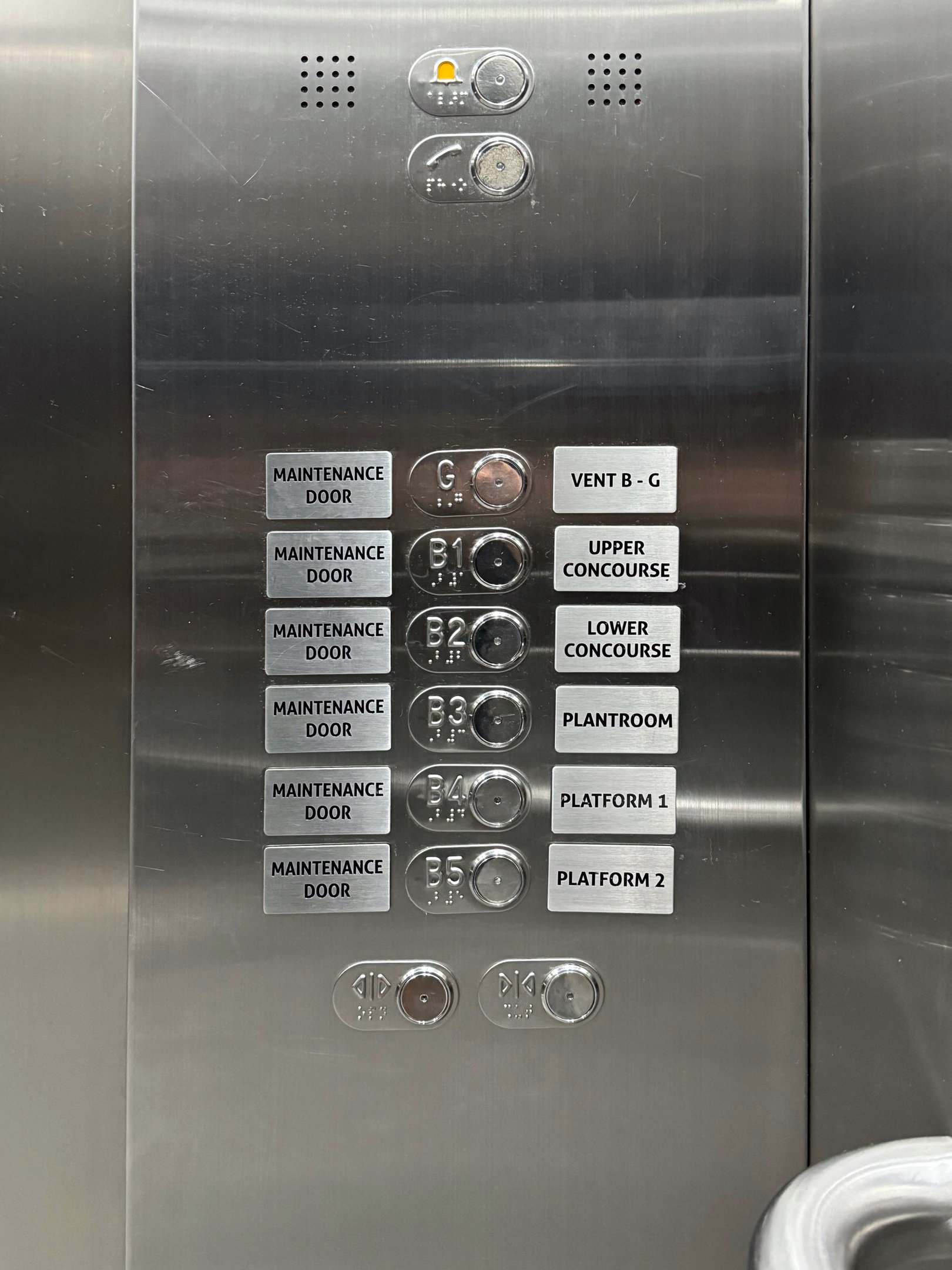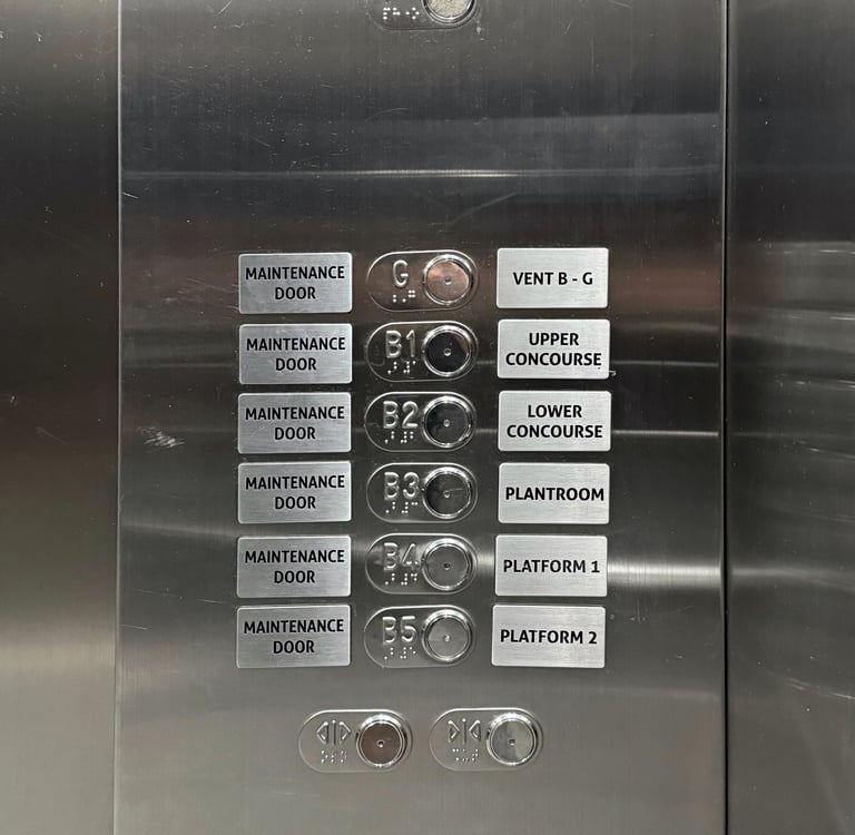 Some panels overwhelm users by presenting every possible destination: ventilation levels, maintenance doors, back-of-house spaces and operational zones. These buttons may be meaningful to staff but introduce unnecessary noise for the public.